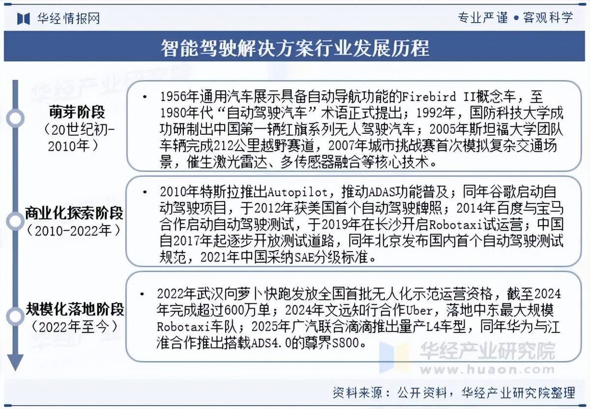 97国际-至尊品牌,源于信誉智能驾驶解决方案是通过整合硬件、软件和算法技术,实时处理车辆环境数据并自主决策,实现在不同交通场景下安全、舒适的行车或泊车功能的系统。智能驾驶解决方案行业的发展历程大致可分为三个阶段:萌芽阶段(20世纪初-2010年)、商业化探索阶段(2010-2022年)与规模化落地阶段(2022年至今)。