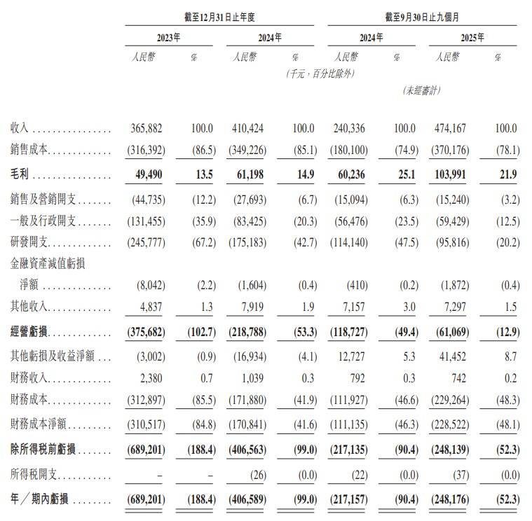 于2023年度、2024年度、2024年截至9月30日止九个月、2025年截至9月30日止九个月,公司分别录得年╱期内亏损约6.89亿元、4.07亿元、2.17亿元、2.48亿元。亏损乃由于以下因素:持续的研发投入、公司仍处于业务扩张阶段、与赎回负债相关的财务成本。