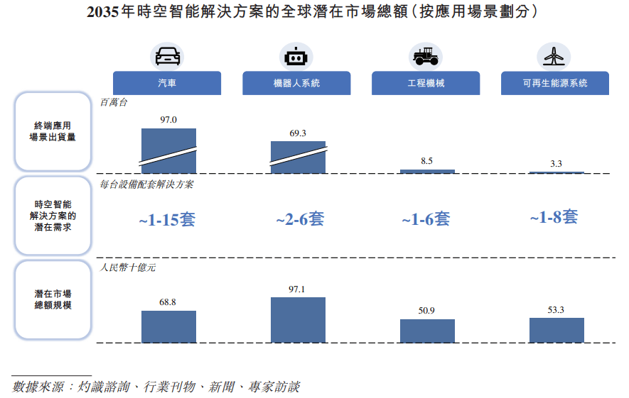 在此背景下,中国市场预计将从2024年的人民币10亿元攀升至2030年的人民币129亿元,复合年增长率为53.7%,并进一步加速增长至2035年的人民币557亿元,这意味着2030年至2035年间的复合年增长率为33.9%。如此快速的市场扩张,得益于时空智能解决方案在各大下游领域较高且持续提升的渗透率;到2035年,时空智能解决方案在全球各领域的渗透率分别为:汽车领域约85%、机器人系统领域45%、工程机械领域80%、可再生能源系统领域45%。数字背后凸显成熟领域的广泛落地及新兴领域的巨大增长潜力。