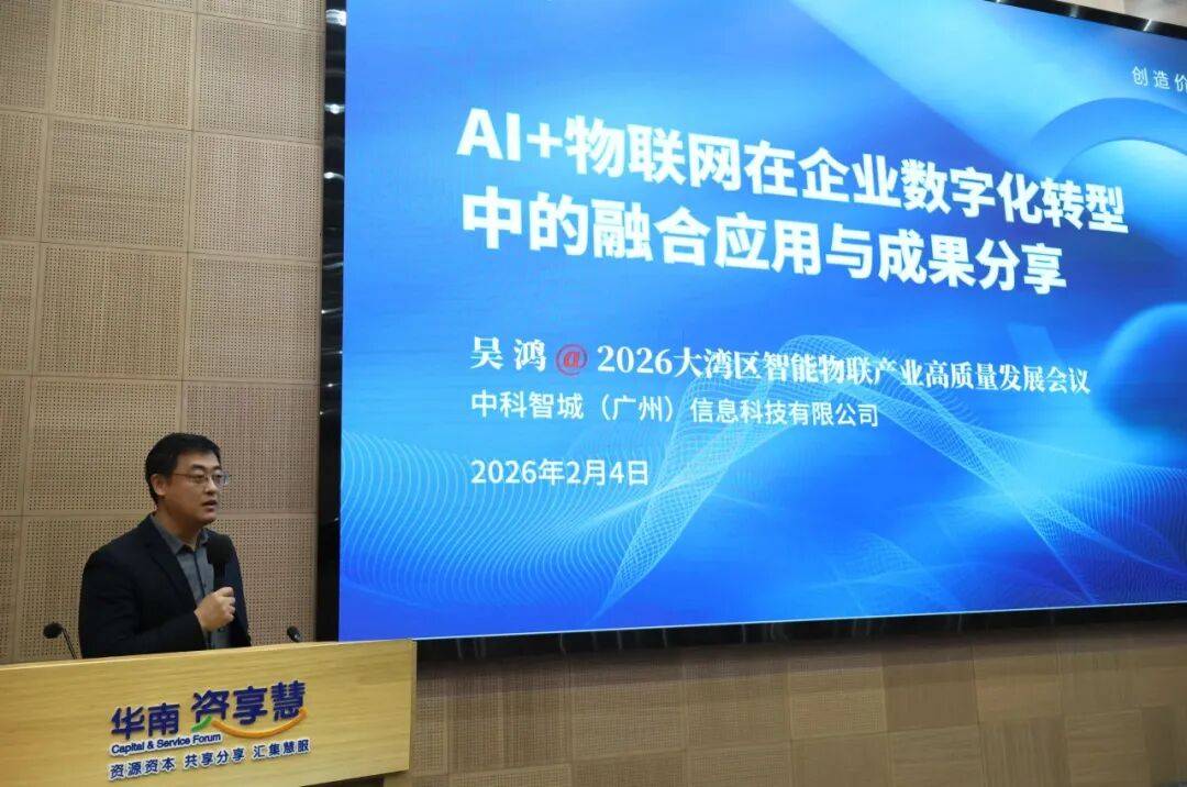 中科智城(广州)信息科技有限公司人工智能研究院院长吴鸿,带来主题 “AI + 物联网在企业数字化转型中的融合应用与成果分享”。吴院长表示,中科智城以物联网、AI、大数据等五大技术为支撑,构建数智中台,针对企业 “三明治” 结构需求,提出 “顶层设计、平台赋能、数据驱动、场景牵引” 的系统转型路径,通过技术融合赋能政企高效转型,AIoT 融合可有效提升智能决策、设备协同效率与数据价值。